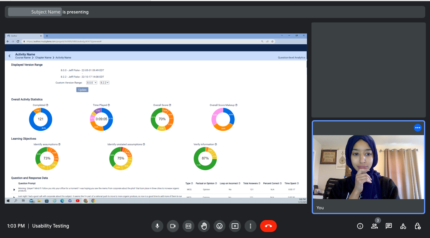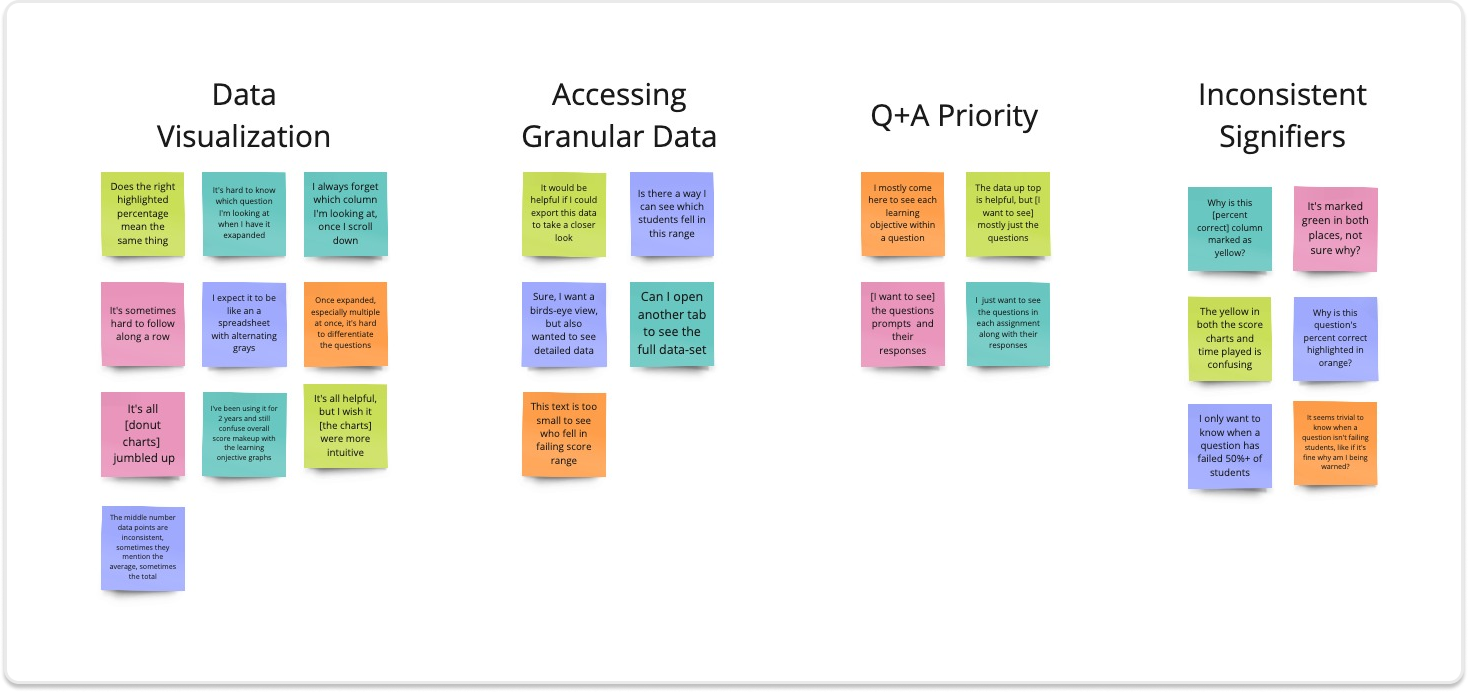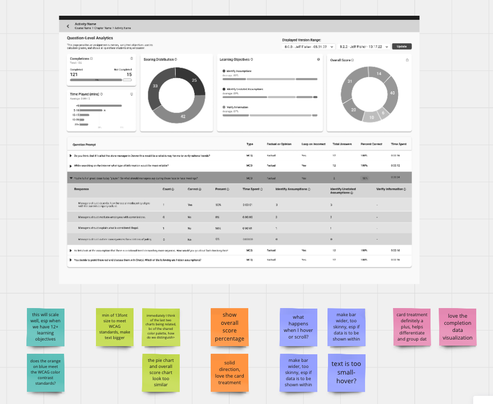 While instructors found the data informative, 3/5 mentioned that they mostly wanted to review the questions and responses assigned- a table shown below the fold on their desktops.