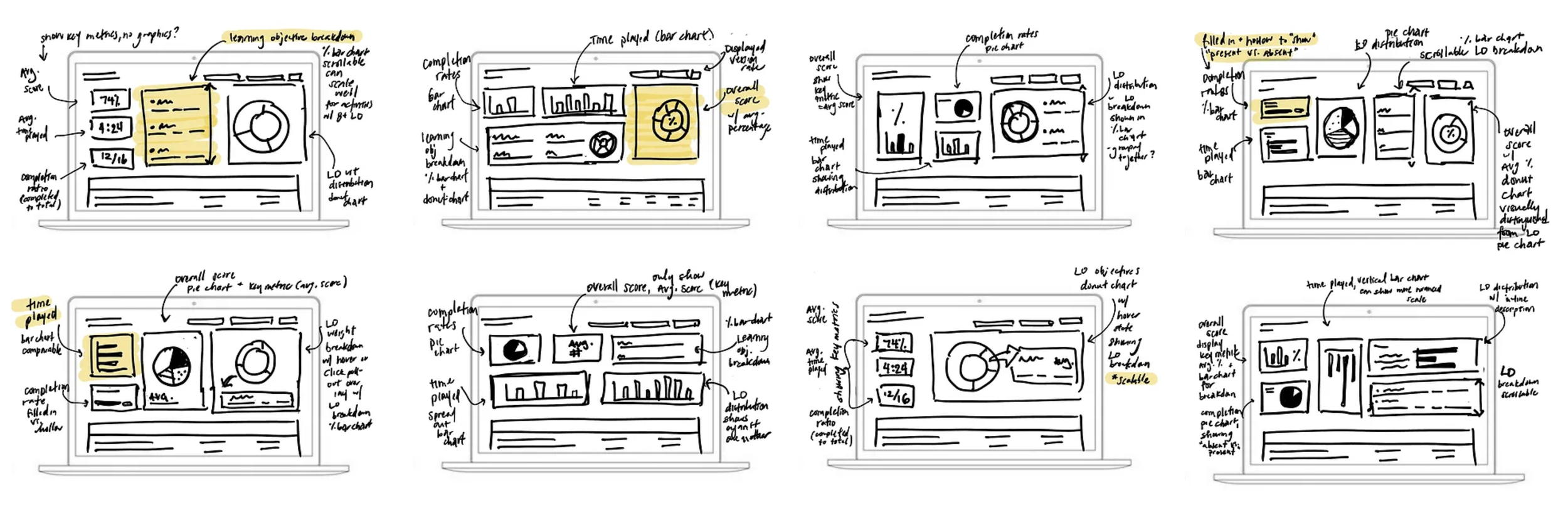 With my design principles and objectives in mind, I sketched a variety of solutions and began exploring a range of UI treatments that would effectively communicate the data and key metrics.