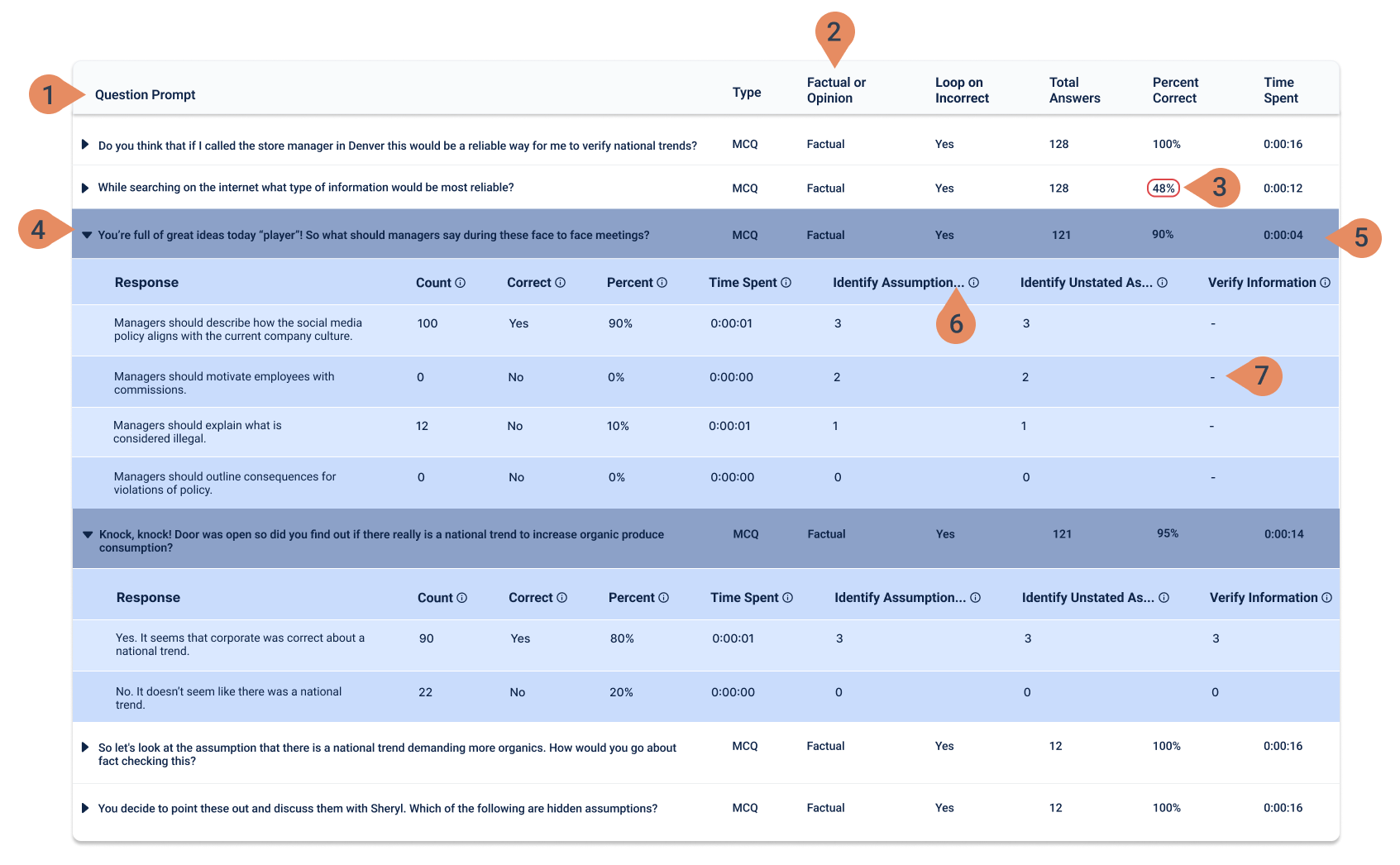 5. Expanded state now displays the question and responses within a colored background, easing the instructor's ability to differentiate row types. Alternating response rows are treated with a slightly differentiated shade to ease visual strain