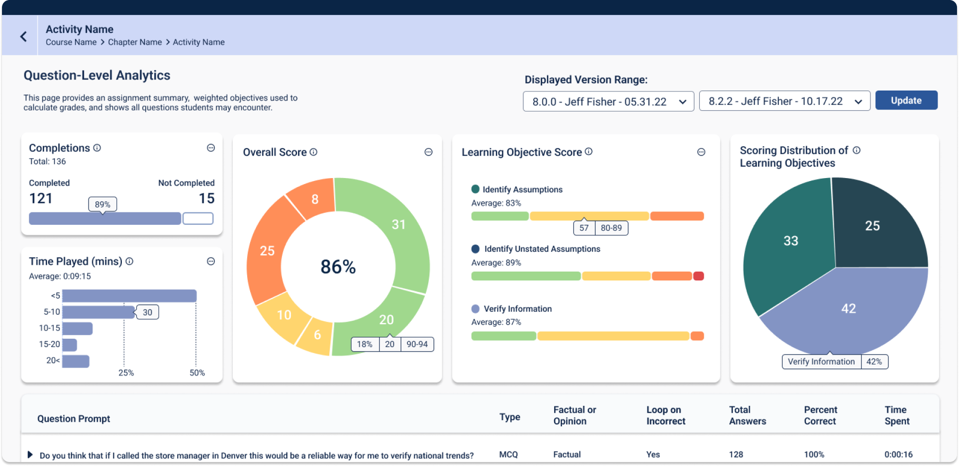 7. Questions that are not scored within a learning objective now have hyphens to communicate the empty state, and not confused as a loading error