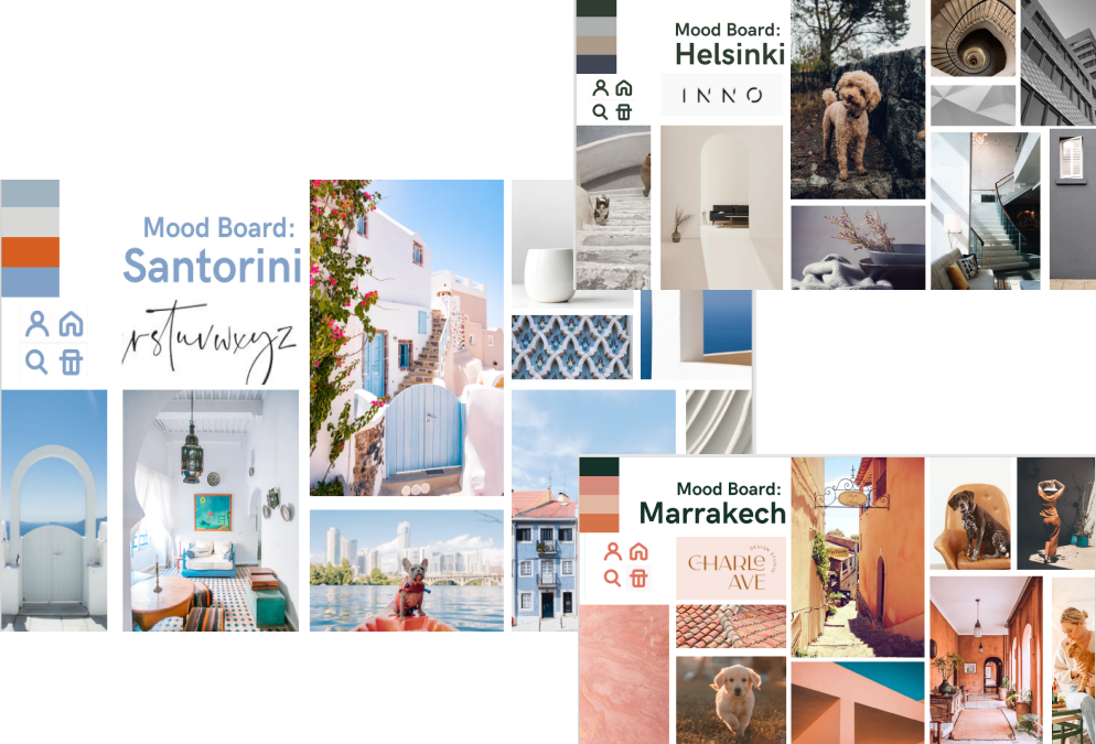 Given the exploratory and fun nature of the app, I opted for the fresh, yet vibrant feel found in the "Santorini" mood board. The cool tones found in the blue, off-white, and gray help enforce the efficient and intuitive nature of the app, while the terracotta offers a warm and vibrant shade.