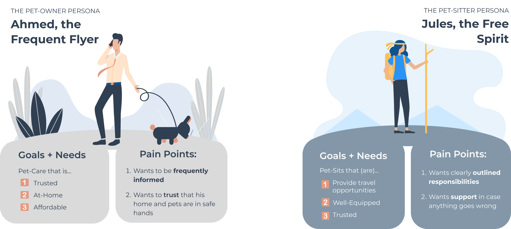 To further define the problem space, user interviews were held at a dog park, where pet owners and pet-sitters provided crucial insight into common pain points surrounding pet care.