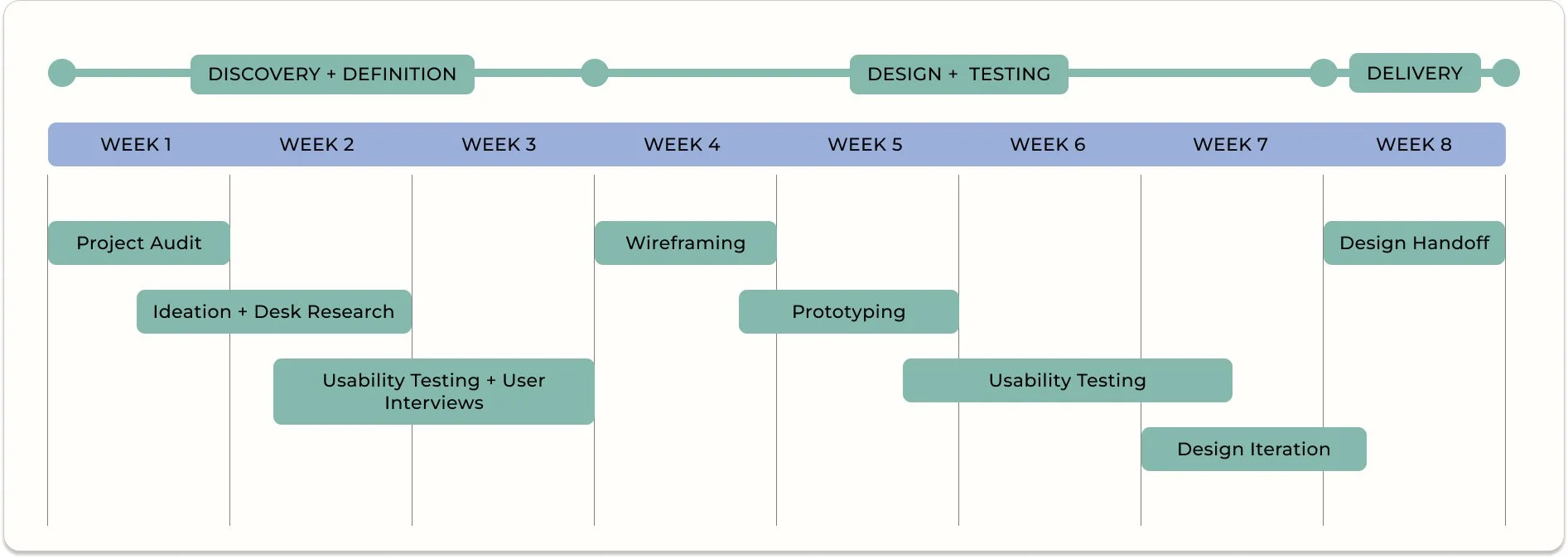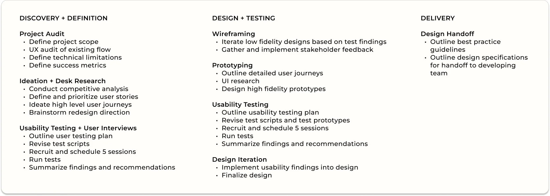 As the sole UX designer and researcher, I met with stakeholders to shape the redesign's vision, scope, and success metrics. Additionally, I led discussions around the project roadmap and identified key deliverables to ensure a comprehensive and aligned design process.