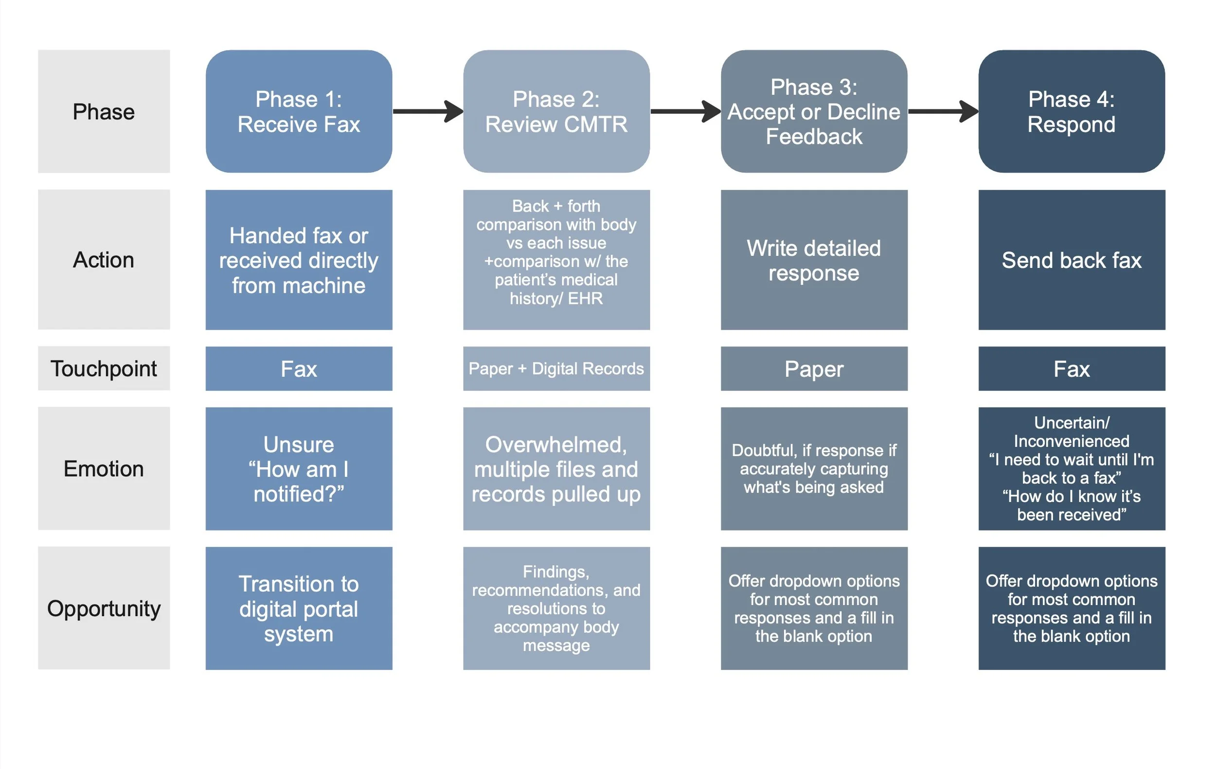 Initial direction was to transform the CMTR experience from fax-based to a digital platform. However, user interviews revealed a surprising preference for the existing fax system due to its benefits: