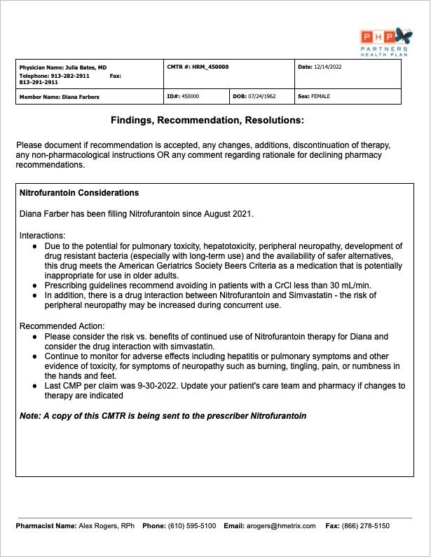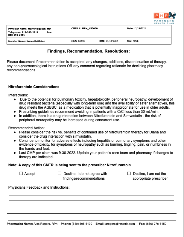 Partners Health Plan is authorized to review its members' prescriptions. Findings are then shared in the form of a Clinical Medication Therapy Review (CMTR) with a patient's physician.