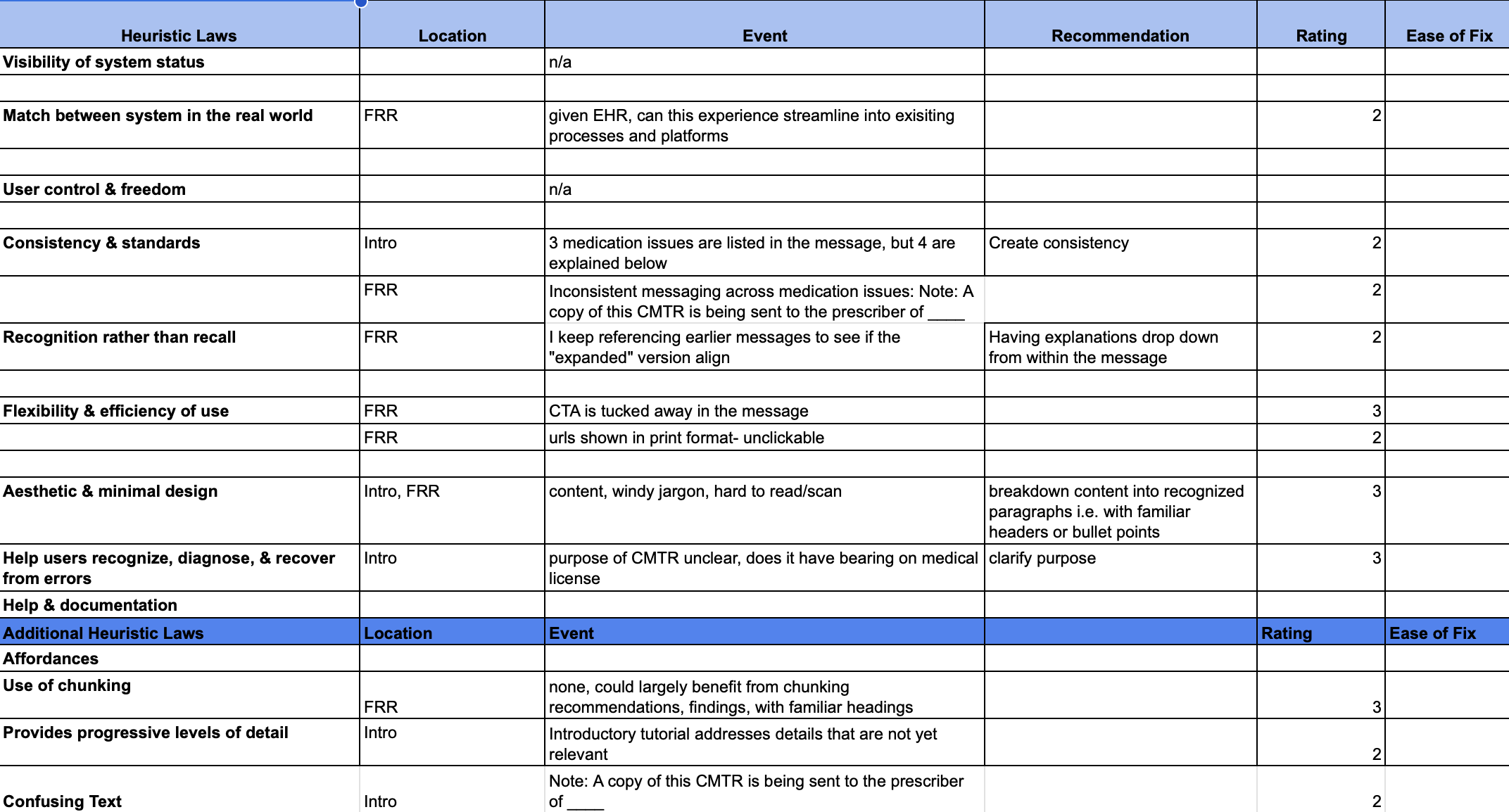 Usability testing, using the pre-existing CMTR to understand how they navigated the interface, reviewed mock medication requests, and the flow's overall usability and functionality.